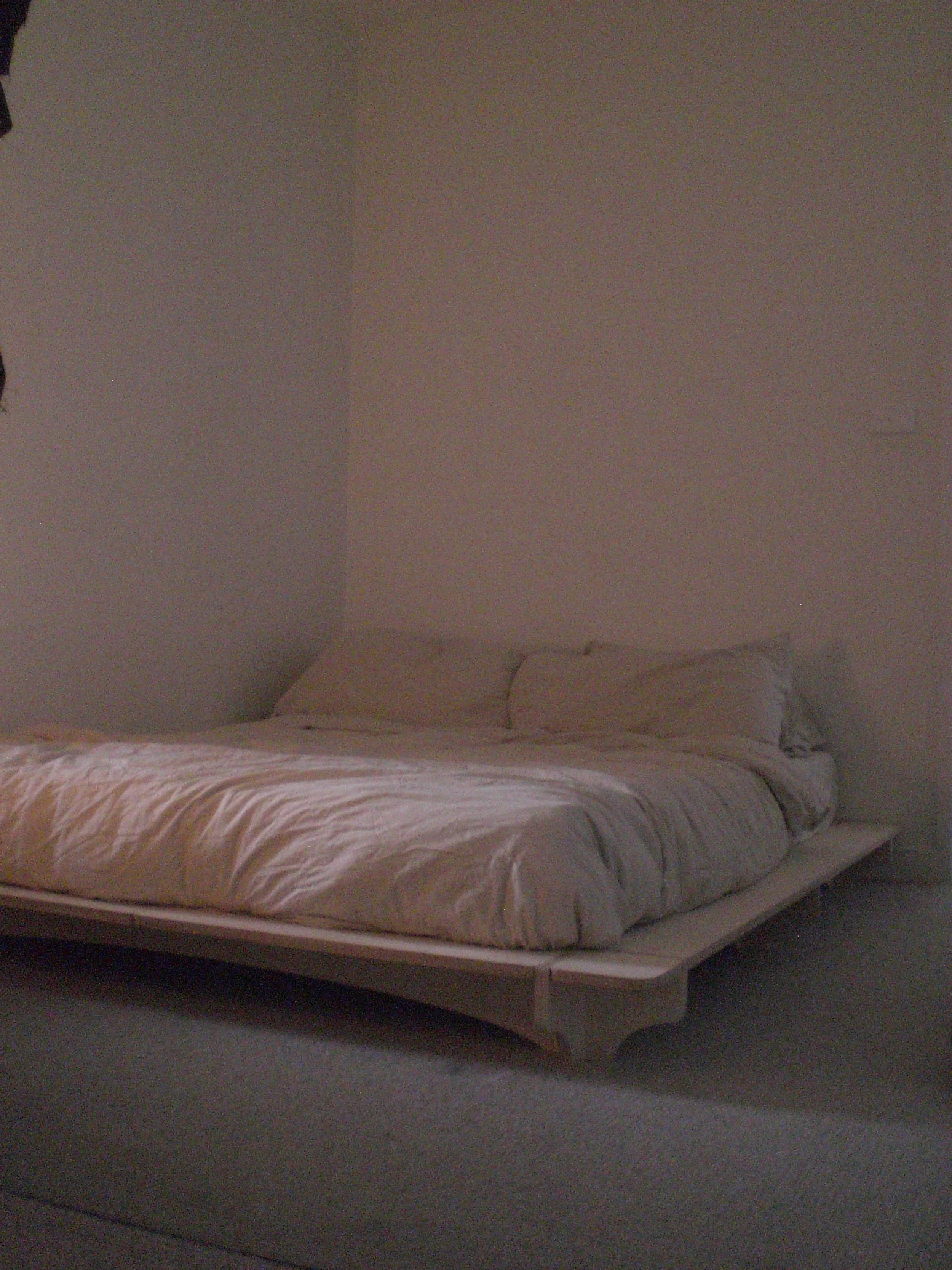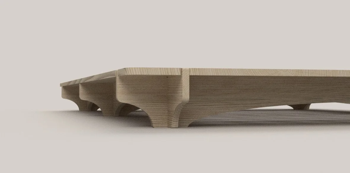 The arch bed appears as though it is levitating when viewed from above. The design of the feet and arches remove a signifigant amount of material from view, accentuating the platform that the bed rests on.